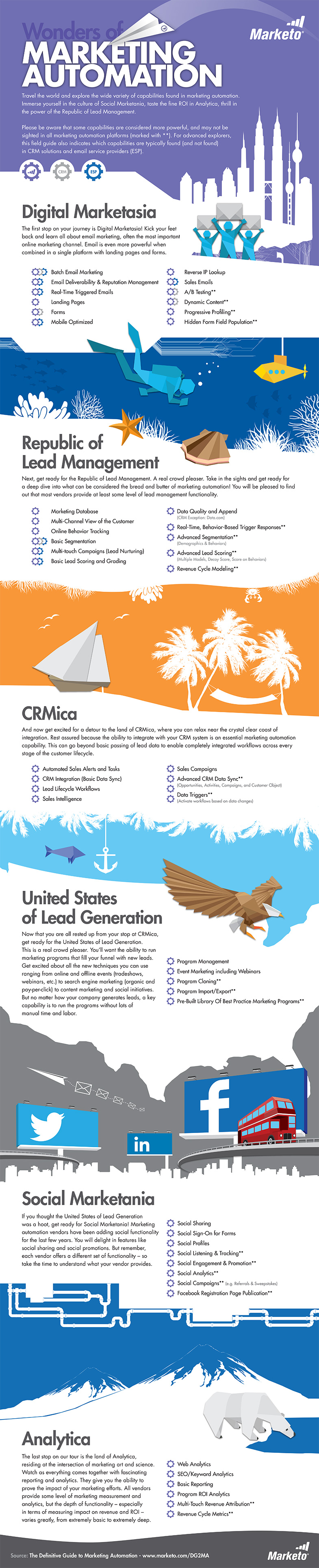 Marketing automation enables activities such as lead generation and scoring, segmentation and up selling at any scale. Common features of marketing automation include autoresponders,  email marketing, customer segmentation, landing pages, A/B testing, conversion optimization, social media engagement, marketing analytics and more. It is more than just marketing via email or a way to deliver spam. Marketing Automation provides a platform for the advancement and nurturing of relationships that lead to people who are not yet ready to buy. It also retains customer relationships and aligns markets with sales, thus improving the ROI.